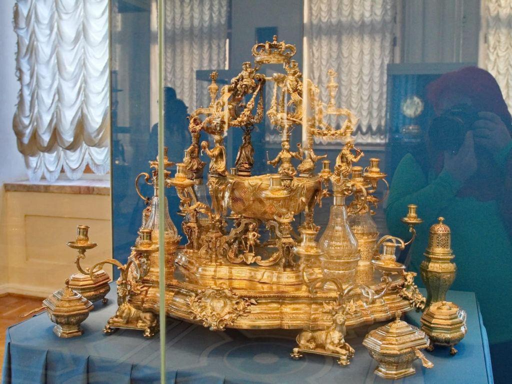 Настоящий шедевр коллекции — блюдо, использовавшееся для украшения стола, под названием «Пладеменаж», выполненное во Франции выдающимся ювелиром, придворным мастером Людовика XV Клодом Баленном II. Внимания также заслуживают предметы из так называемого Английского сервиза Екатерины I и двуручный кубок.